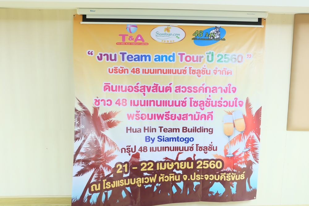 งาน Team and Tour ปี 2560 บริษัท 48 เมนเทนแนนซ์ โซลูชั่น จำกัด ดินเนอร์สุขสันต์ สวรรค์กลางใจ ชาว 48 เมนเทนแนนซ์ โซลูชั่นร่วมใจ พร้อมเพรียงสามัคคี Hua Hin Team Building By Siamtogo กรุ๊ป 48 เมนเทนแนนซ์ โซลูชั่น ระหว่างวันที่ 21-22 เมษายน 2560 ณ โรงแรมบลูเวฟ หัวหิน จังหวัดประจวบคีรีขันธ์